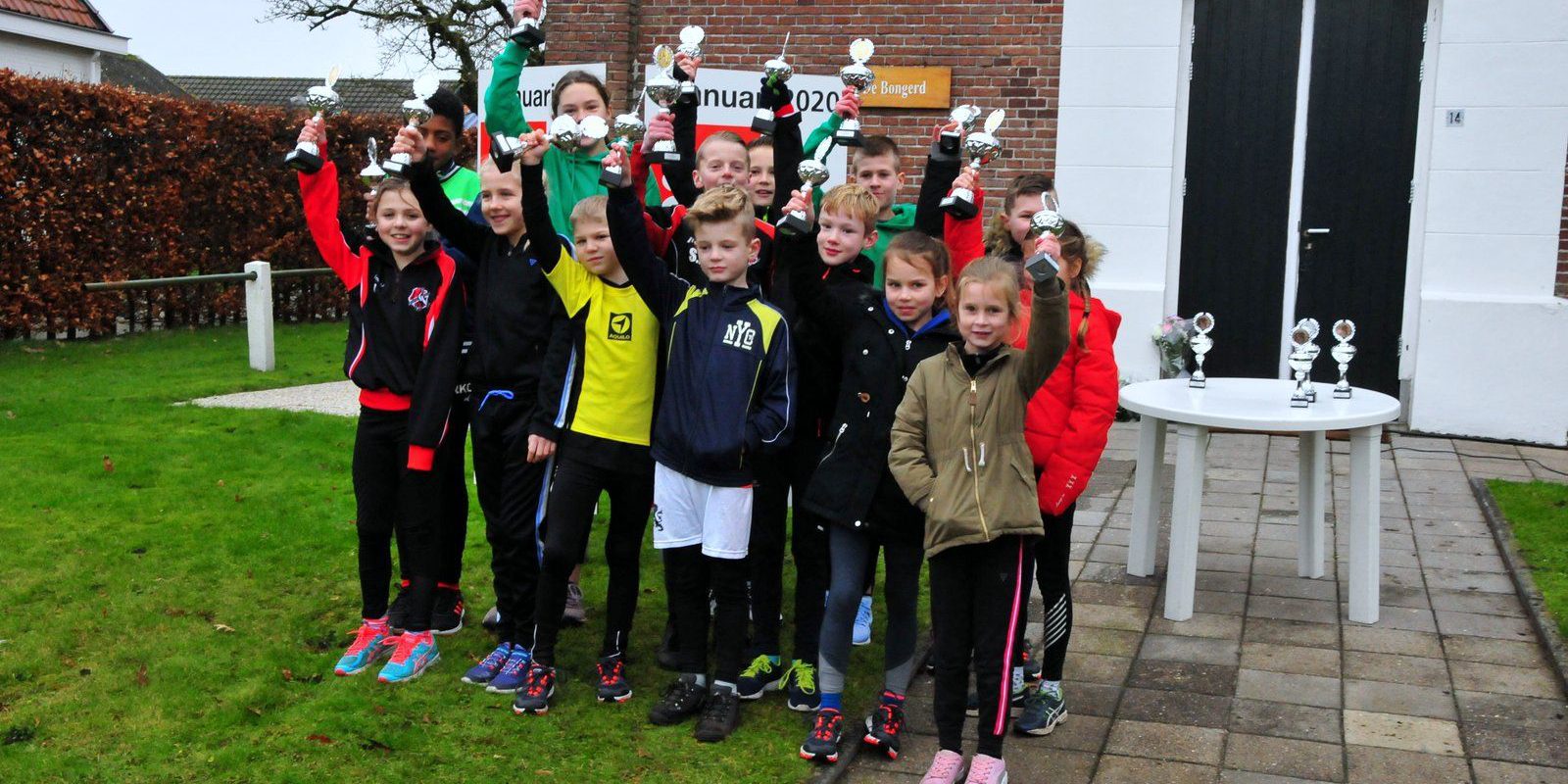 Een prachtige hardloopmiddag, afgelopen zaterdag. Voor de 40e keer werd onze Nieuwjaarsloop gehouden en terugkijkend naar de foto’s kwamen eigenlijk alle lopers -vrolijk begeleid door muziek en spreekstalmeester Michel de Krijger- met een brede tevreden lach over de finish. Onderweg wel een lastige strakke west-oost wind, maar het was niet te koud en tot ver in de wedstrijd bleef het droog. Zoals gebruikelijk begon het loopfestijn met de kinderraces. Na een enthousiaste strijd werden de glimmende bekers aan de winnende talenten overhandigd. Opvallend: Jorrit Niemeijer uit Nieuwe Pekela verbeterde na 11 jaar het parcoursrecord op de 800 meter met 3 seconden. Proficiat! Net daarvoor werden Tjeerd, Klaas en Ab gehuldigd. In 1981 waren dit -samen met zaterdagtrainer Harm Frieswijk- de bedenkers van onze gewaardeerde hardloopwedstrijd.